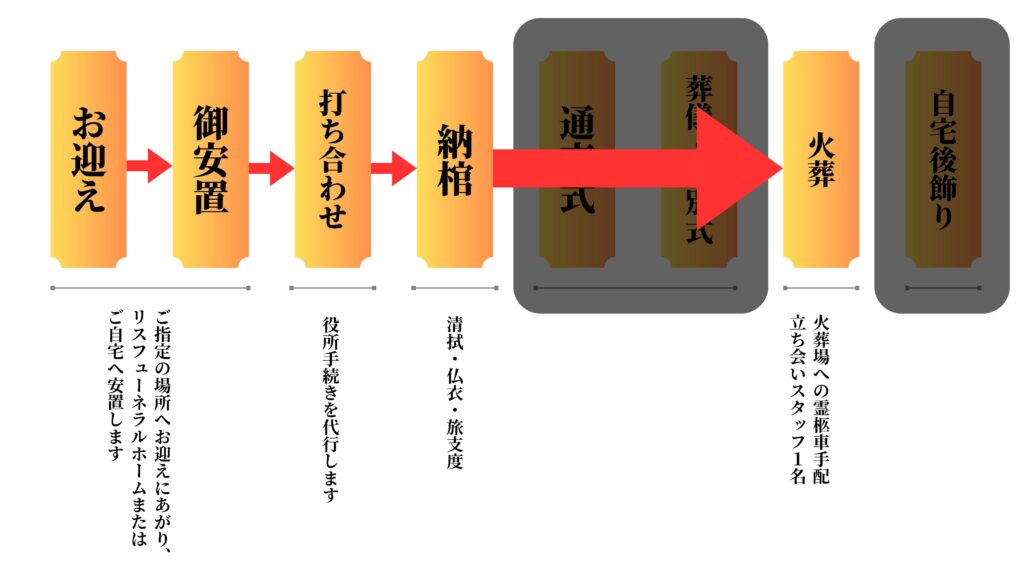 お別れ式 お迎え、安置、火葬のみ お別れ式 お別れ式とは、お通夜・告別式などを行わず、家族や親しい方のみで最低限のお別れを行うシンプルな葬儀です。 ※生花はオプションです。 ¥132,000(税込) ※別途霊柩車料金(距離に応じて金額が変わります)※供花、ご会葬返礼品、お料理等は別途承ります。※公営斎場は別途使用料がかかります。(金額は各斎場によって異なります)