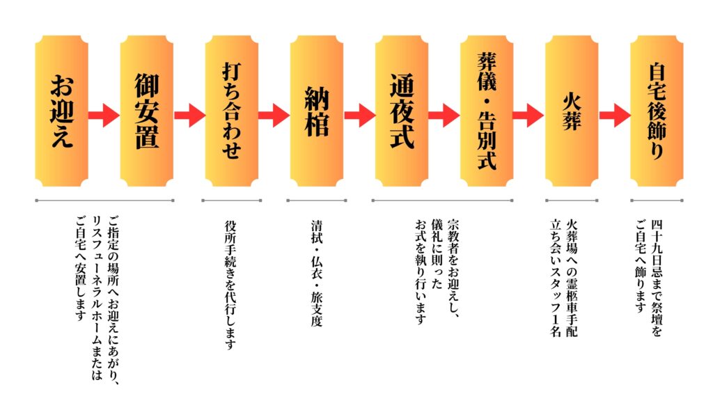 家族葬 公営・提携民間式場を利用し、通夜・告別式を行う家族葬 家族葬 ご希望の式場を使用して行う家族葬です。 ご家族と、所縁あるご親族を招き、近しいご友人の方々ともお別れの時間を過ごしていただくプラン。 通夜式・葬儀式ともに宗教者をお迎えしてを執り行います。 ※生花はオプションです。 ¥275,000(税込) ※別途霊柩車料金(距離に応じて金額が変わります)※供花、ご会葬返礼品、お料理等は別途承ります。※公営斎場は別途使用料がかかります。(金額は各斎場によって異なります)