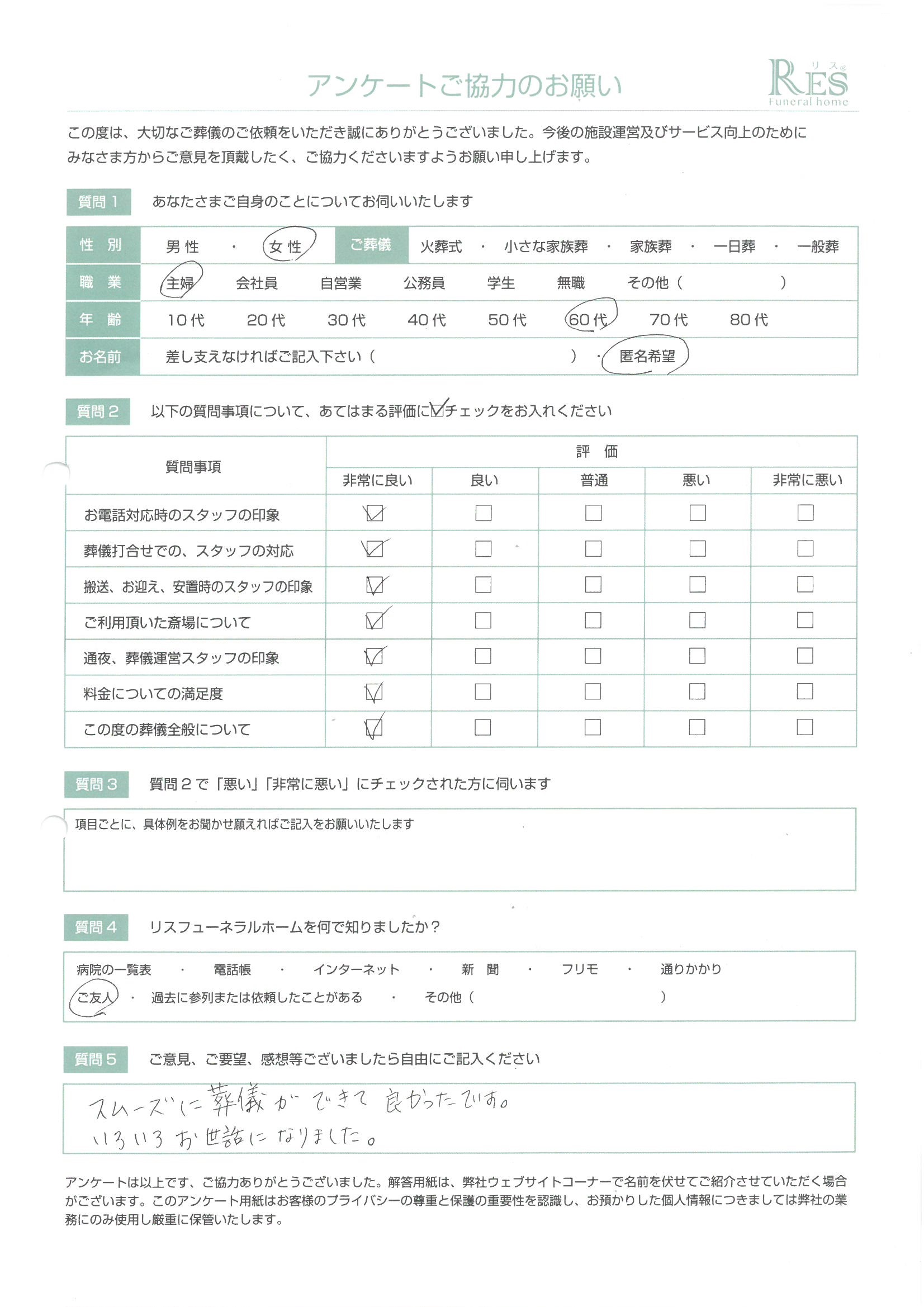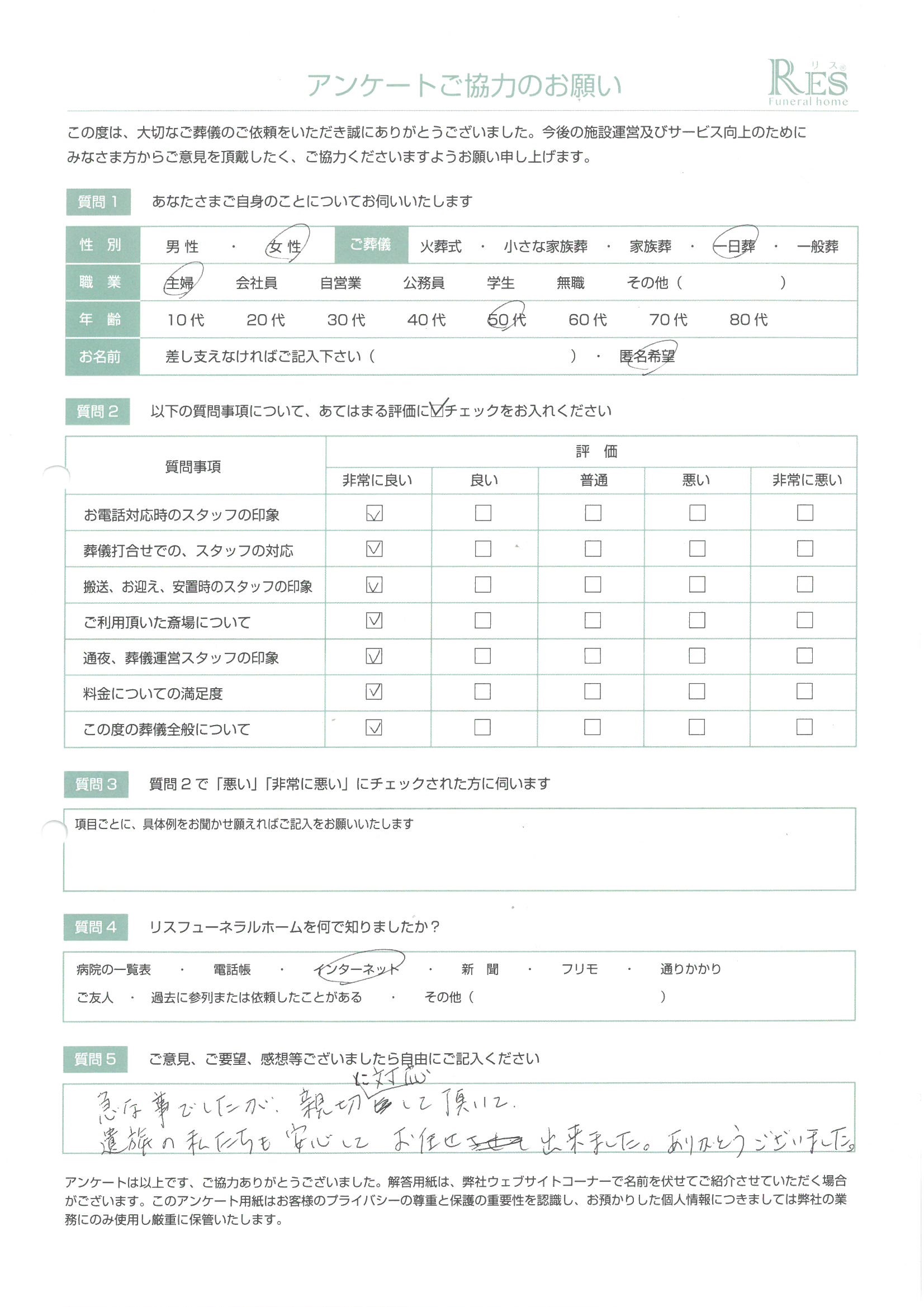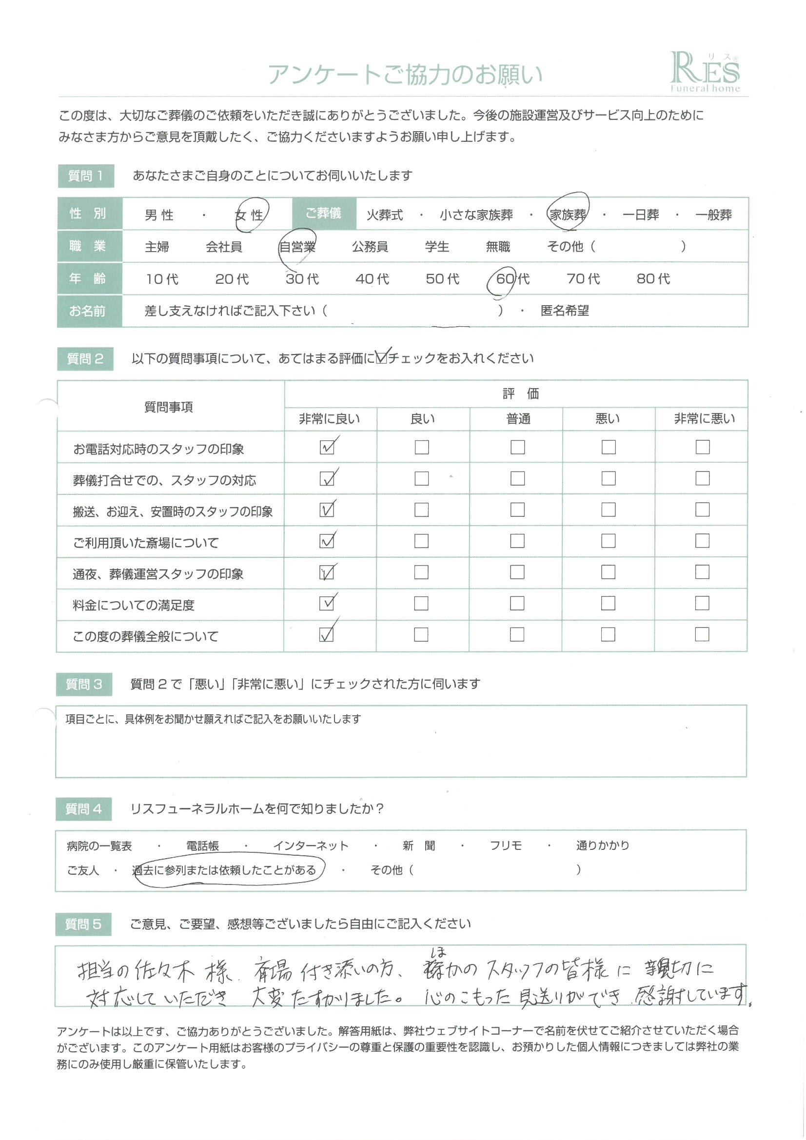 担当の佐々木様、斎場付き添いの方、ほかのスタッフの皆様に親切に対応していただき 大変たすかりました。心のこもった見送りができ 感謝しています