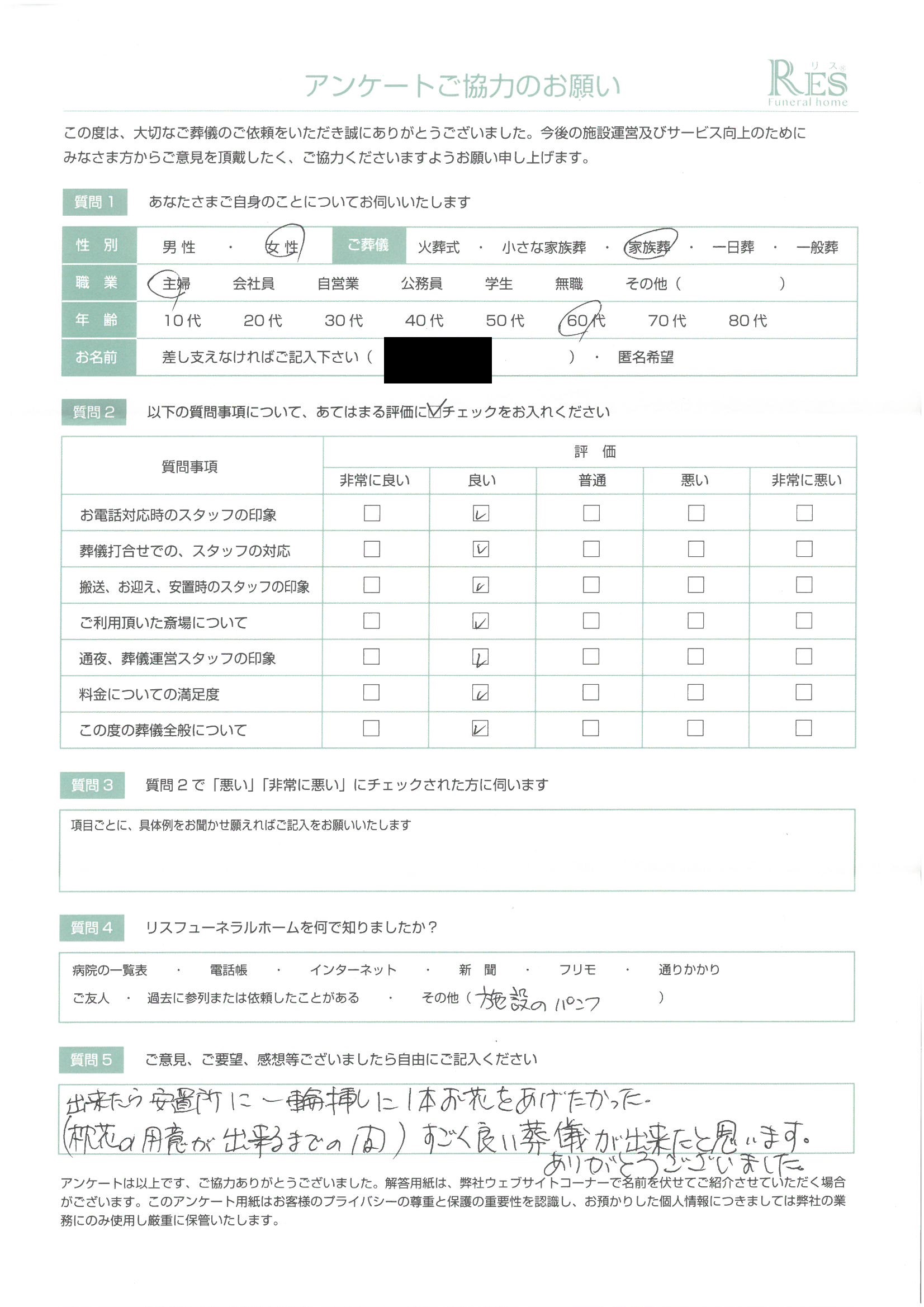 出来たら安置所に一輪挿しに1本お花をあげたかった。(枕花の用意が出来るまでの間)すごく良い葬儀が出来たと思います。ありがとうございました。