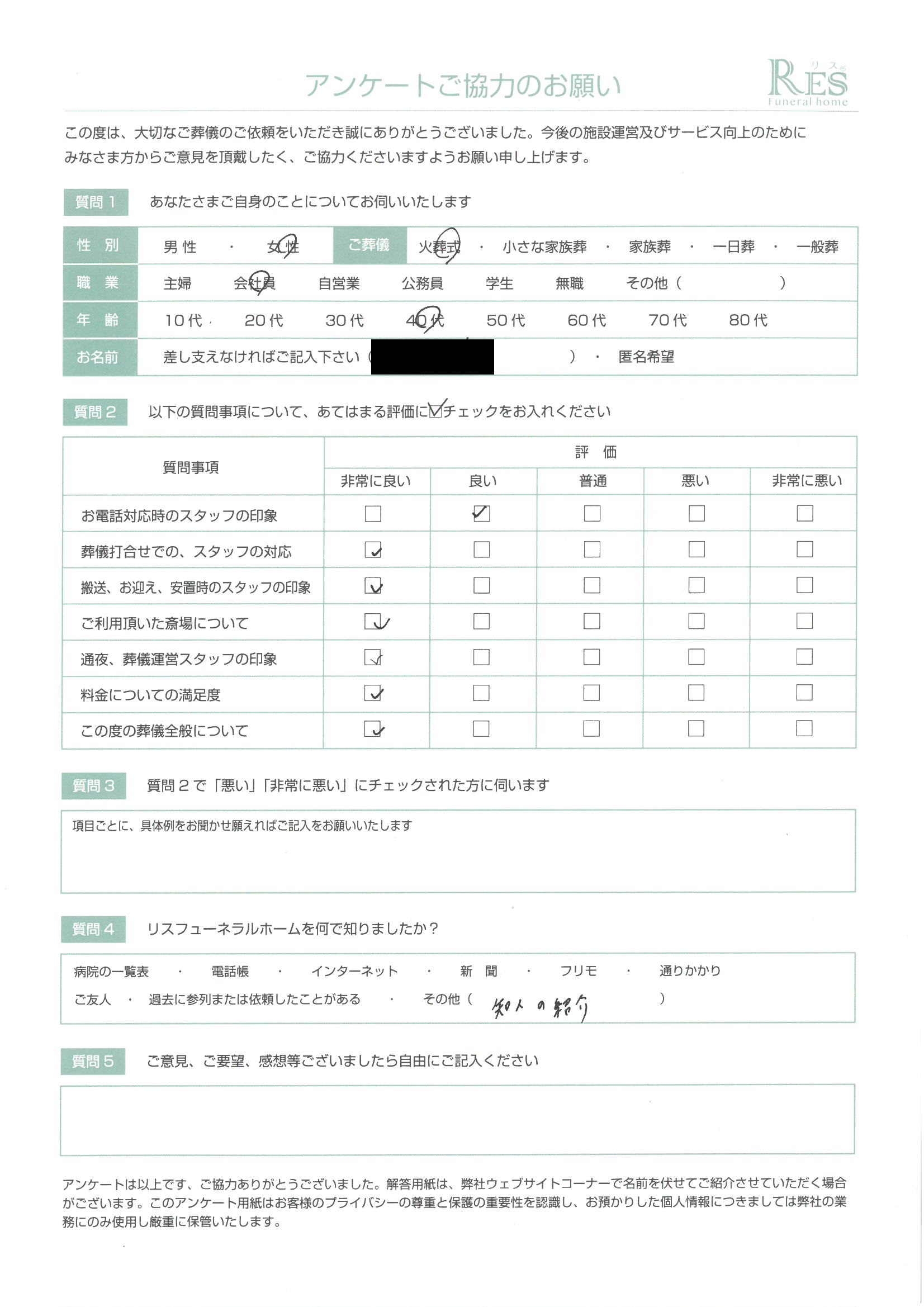 高崎市 Y様 お別れ式 2021/7/2 2021/7/6 お客様の声 担当スタッフのコメント: 後日の集金にお伺いした際に 故人様との思い出など沢山のお話を 聞かせて頂きありがとうございました。 お別れ式といえど気持ちよく お見送りする事が出来て大変満足した と喪主様からお言葉を頂戴頂き この度のご縁に感謝致します。 当社をお選び頂き、誠にありがとうございました。 瀬川 お客様のご意見からの改善:
