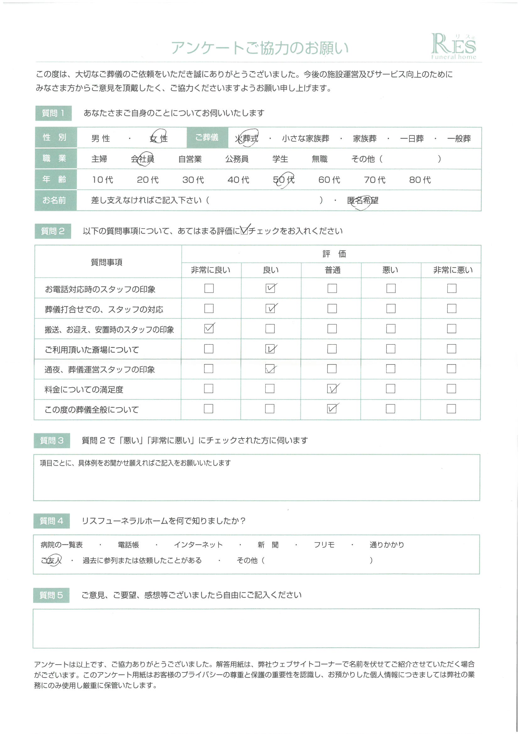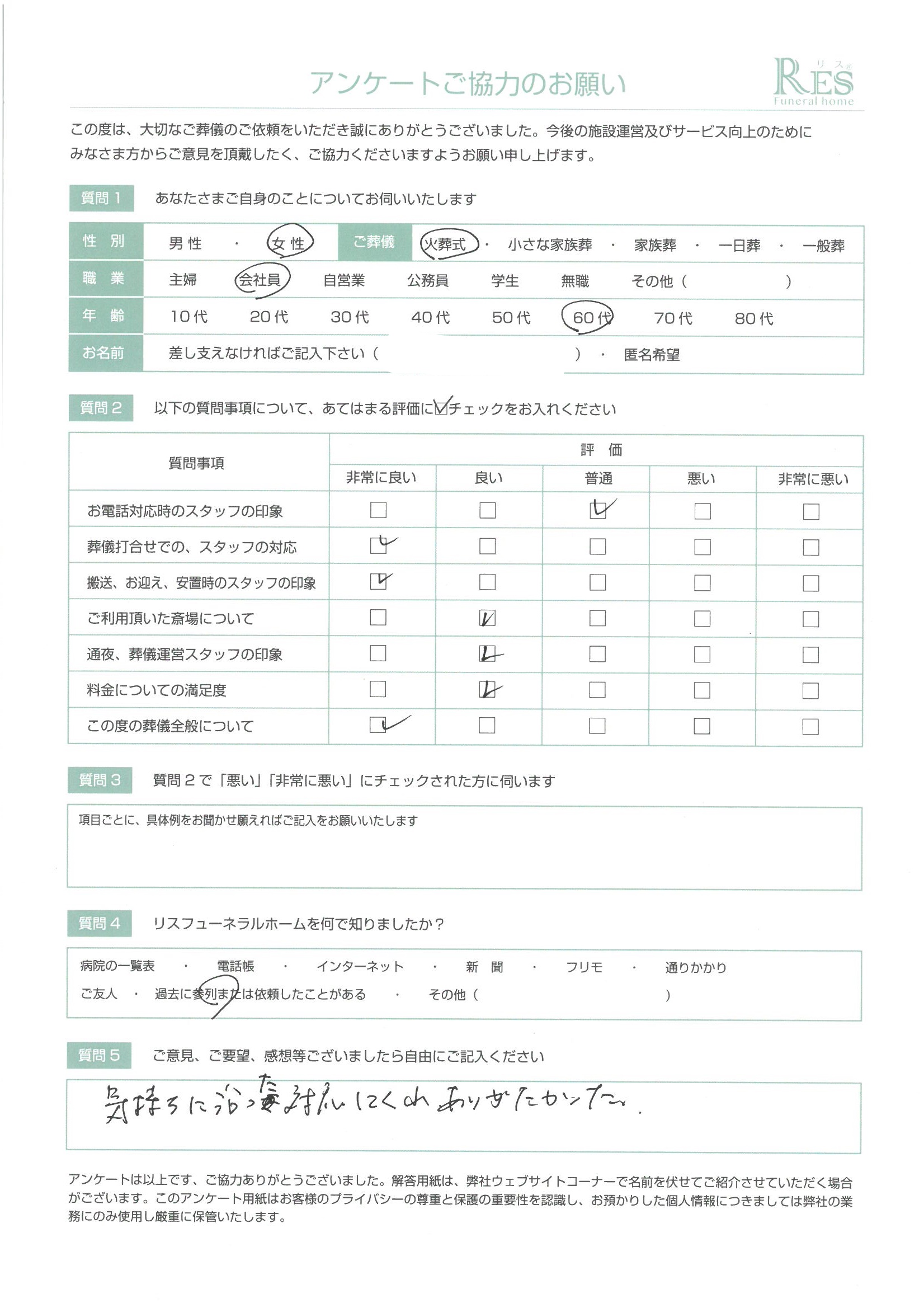 高崎市 Y様 小さな家族葬 2021/8/31 お客様の声 あたたかい対応で満足しました。ありがとうございます 担当スタッフのコメント: 本日はお疲れ様でした。 お亡くなりになったご主人様のご希望でリスの小さな家族葬プランをお選び頂きました。 お式の流れ、やりたい事のご希望をお伝え頂き、後悔の無いお葬儀ができる様、精一杯お手伝いさせて頂きました。 細井 お客様のご意見からの改善: