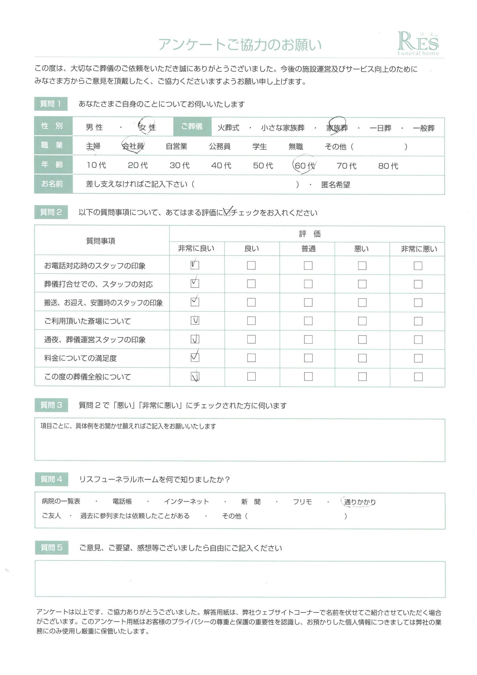高崎市 I様 お別れ式 2021/9/4 お客様の声 担当スタッフのコメント: 急なご逝去となってしまい、ご家族様の悲しみは 計り知れないものだったかと思います。 そんな中でも、最大限のお見送りが出来るよう サポートをさせて頂きました。 この度は当社をご利用して頂き、誠にありがとうございました。 瀬川 お客様のご意見からの改善: