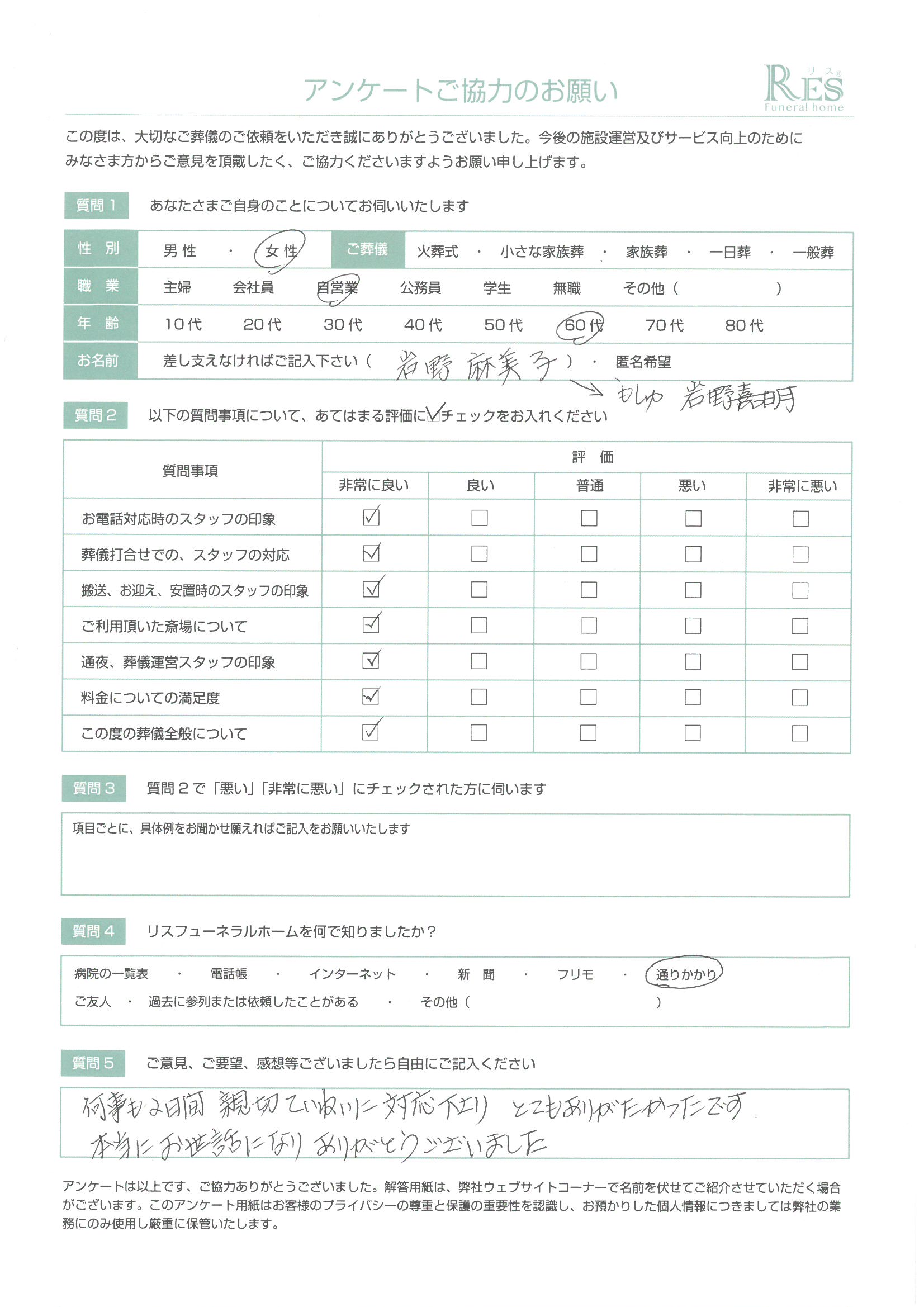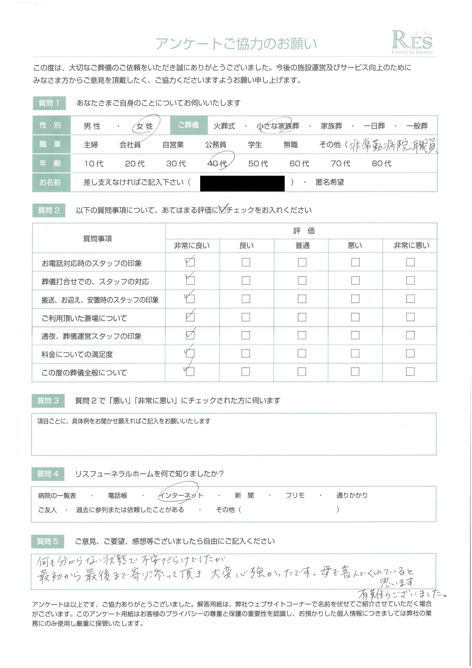 何も分からない状態で不安だらけでしたが、最初から最後まで寄り添って頂き、大変心強かったです。母も喜んでくれていると思います。有難うございました。