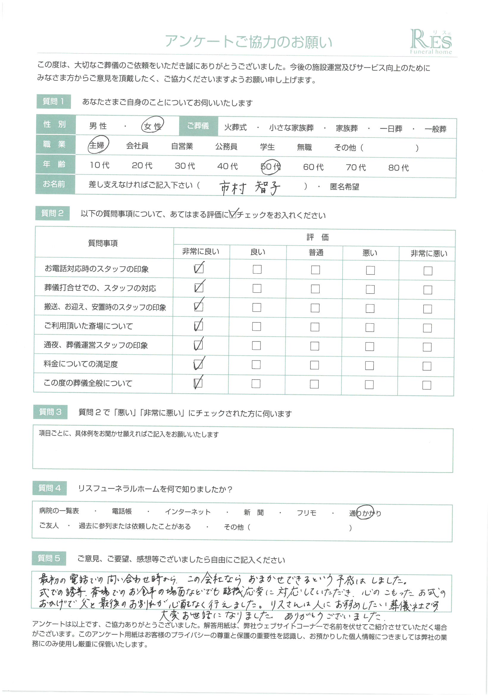高崎市 N様 家族葬(一日葬) (5.0/5) X Facebook はてブ LINE Pinterest コピー 2022.10.182022.10.20 何回もお願いしていますが、その都度、親切に対応して頂いて本当に 助かりました。ありがとうございます