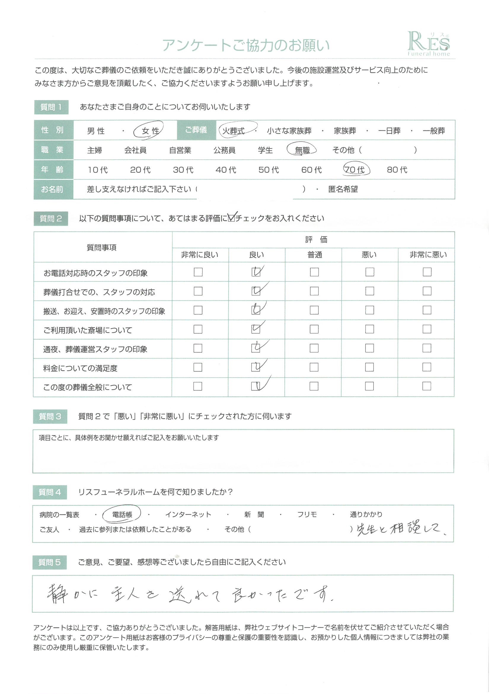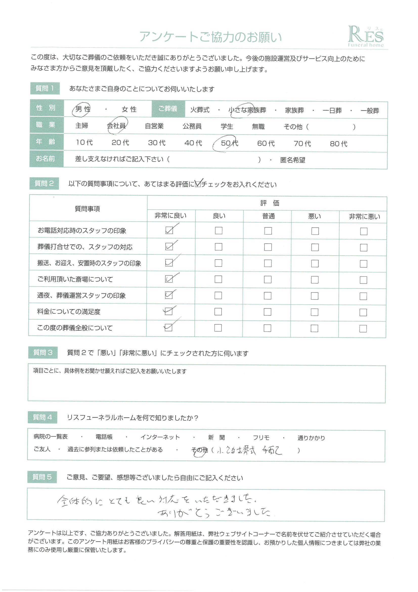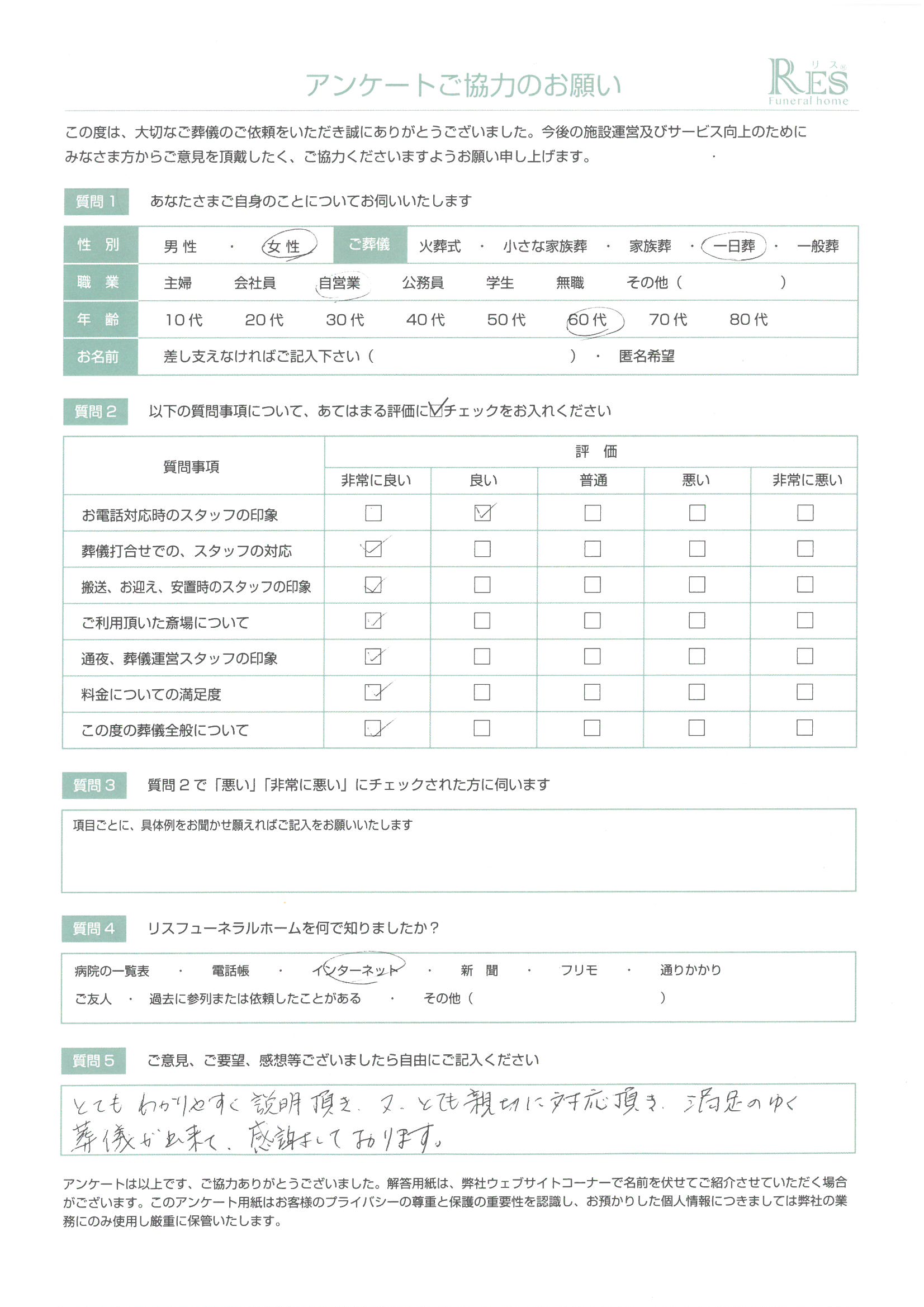 とてもわかりやすく説明頂き、又、とても親切に対応頂き、満足のゆく葬儀が出来て、感謝しております。